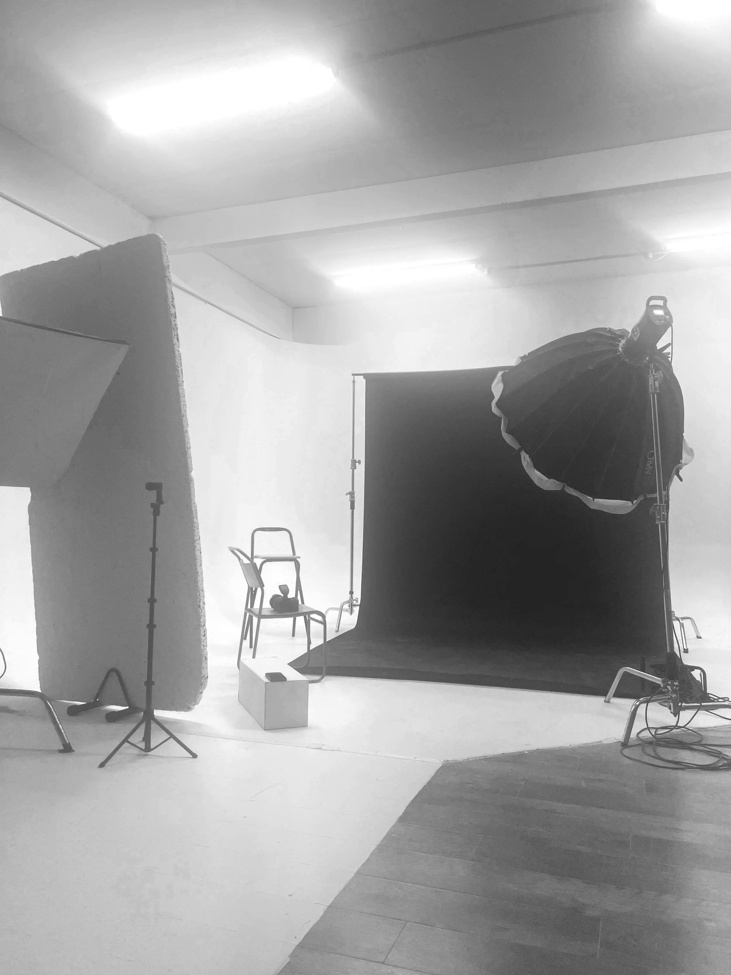 Behind the scenes in the studio… lights, backdrop, and a couple of chairs waiting for their moment.